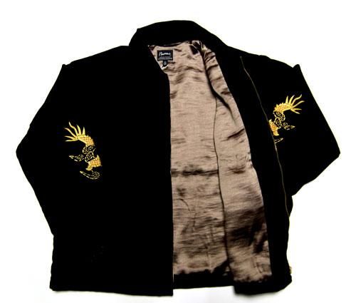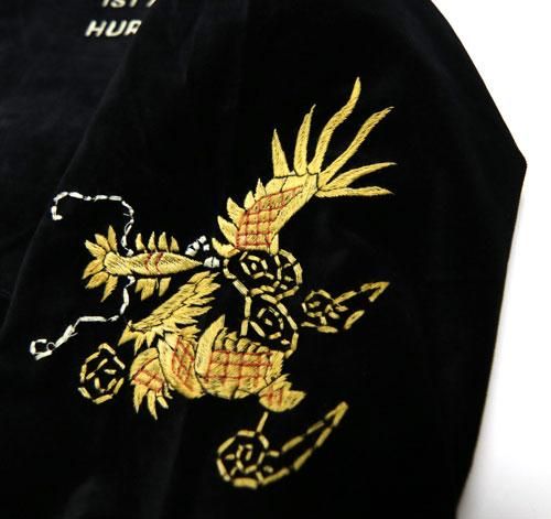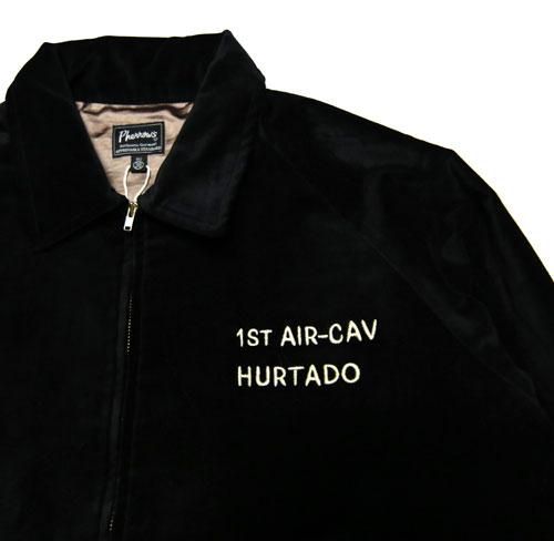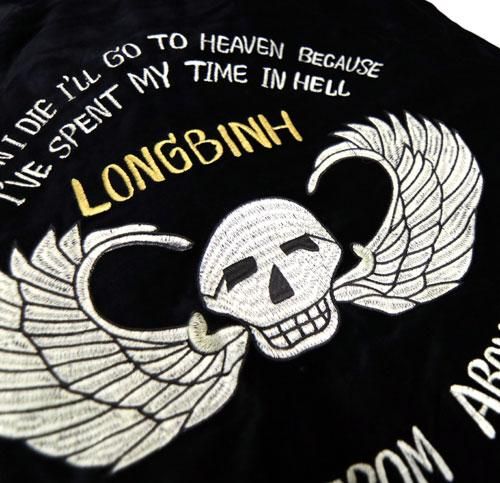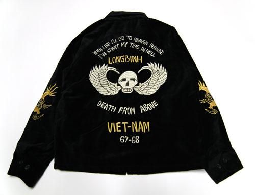 ベトナム戦争の際に空軍の攻撃力の例えとしてよく用いられた「DEATH FRORM ABOVE」 のフレーズを配し、大胆などくろの詩集が存在感を放つスーベニアジャケット。 表地にはコットン別珍、裏地にはポリエステルサテンを使用。上品な光沢を放つ別珍生地うや随所に 施された繊密な刺繍など本格的な仕様。